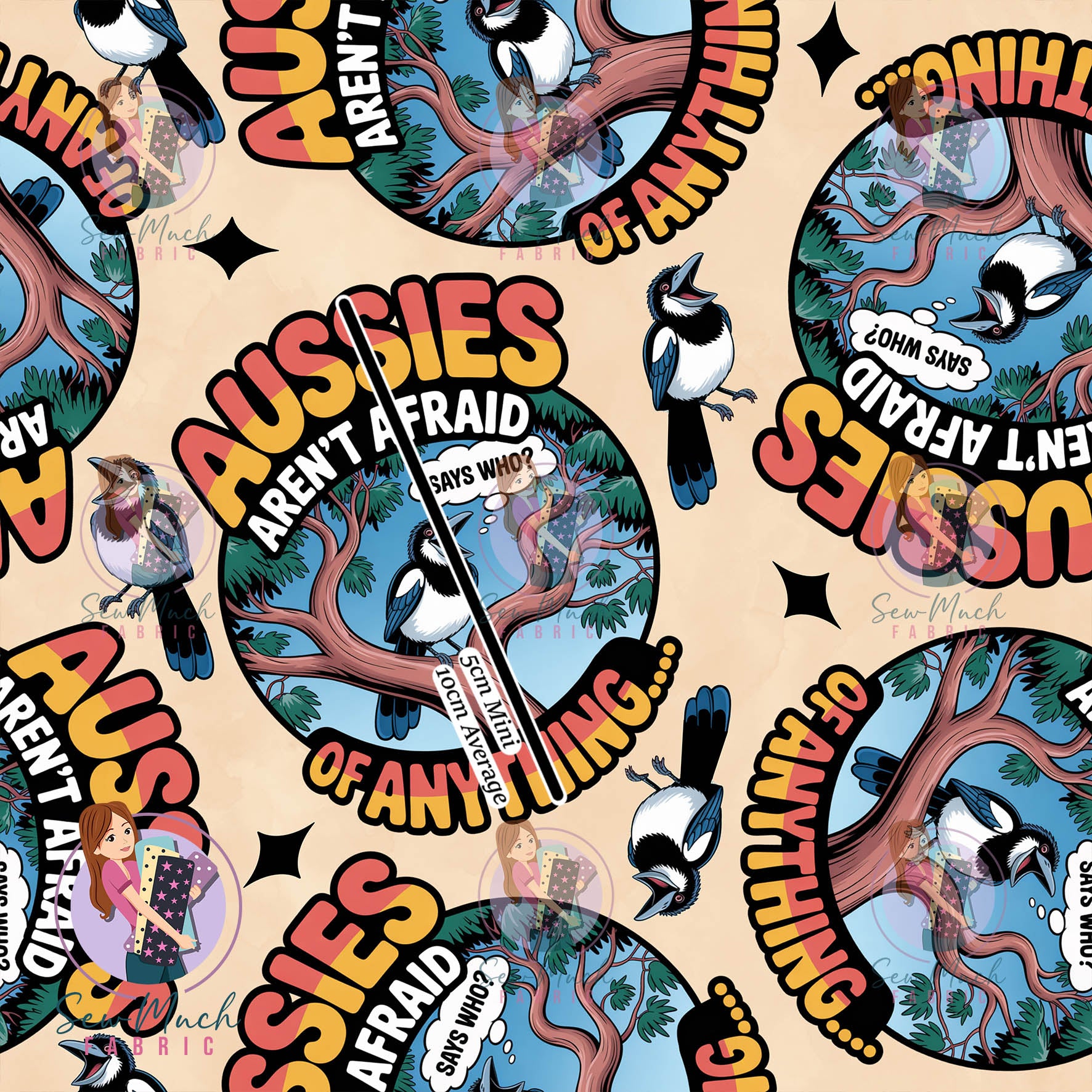 We offer 2 different print sizes: Average and Mini. Please refer to the product title to ensure you are ordering the correct size. Please note that the fabric scale is +/- 1cm